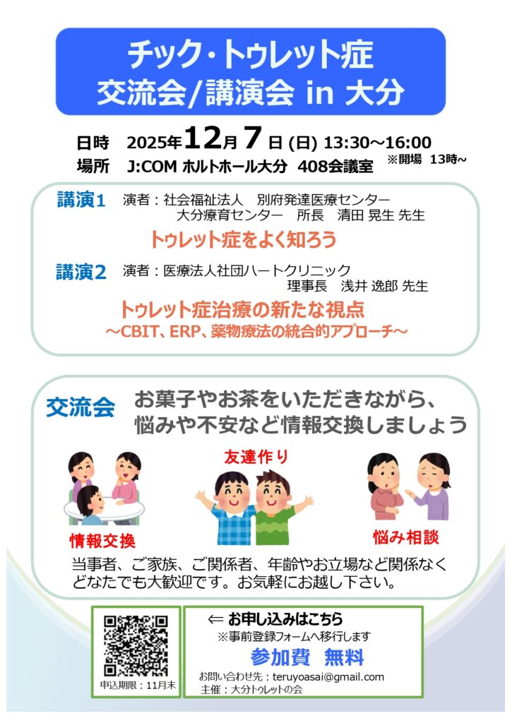 「チック・トゥレット症交流会/講演会 in 大分」の開催が決まりましたので、皆さまにお伝えします。