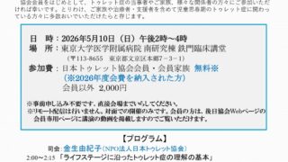 今年の医療講演会2026の開催が決まりました。まだ先の話になりますが、当日は多くの皆さまにご来場して頂きたく、現時点での詳細をお伝えいたします。ライフステージに沿ってトゥレット症を考える~児童思春期を中心に~トゥレット症は、運動チックと音声...